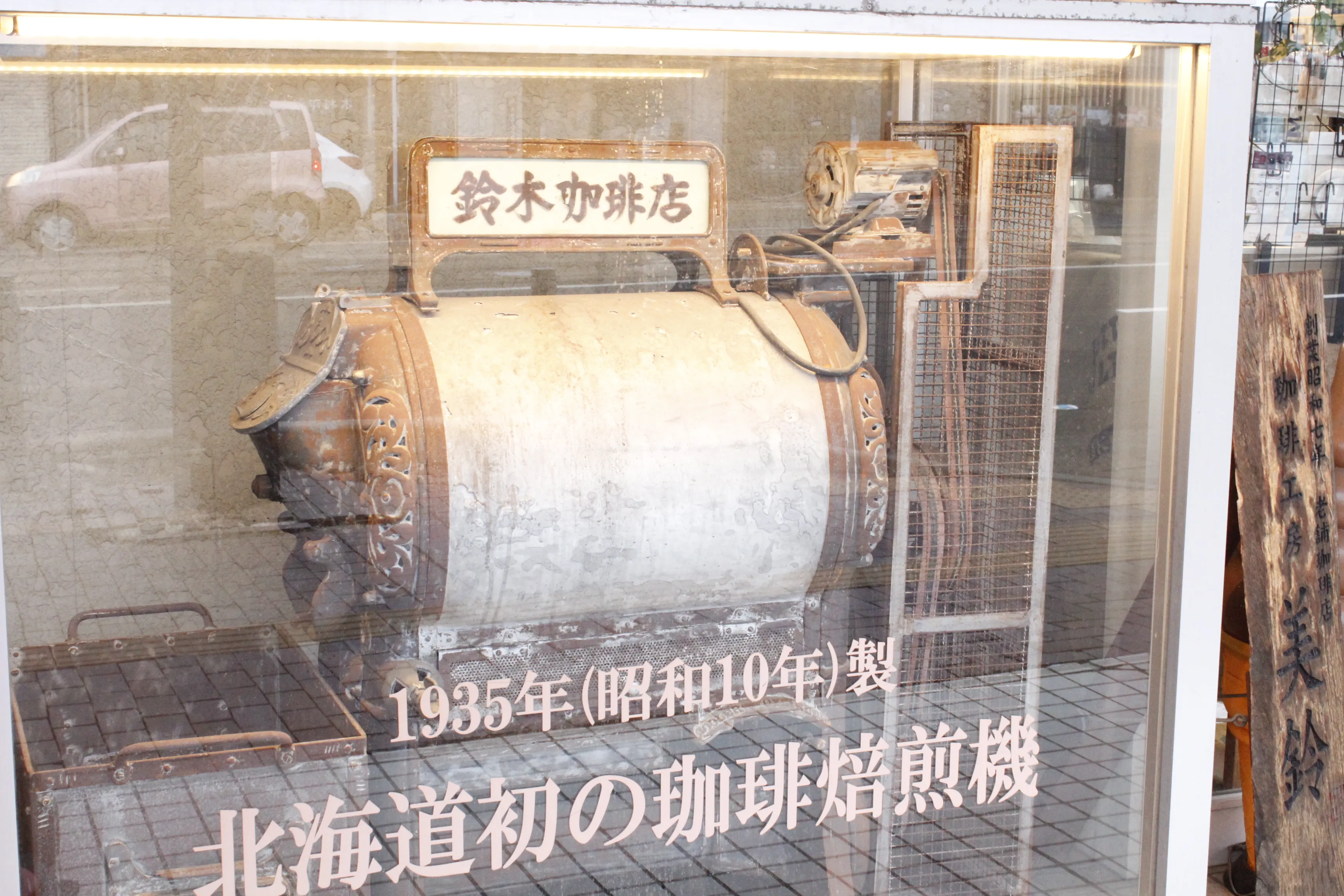 『函館美鈴 大門店』の店頭には、1935年当時に使われていた北海道初の珈琲焙煎機が今も展示されています。